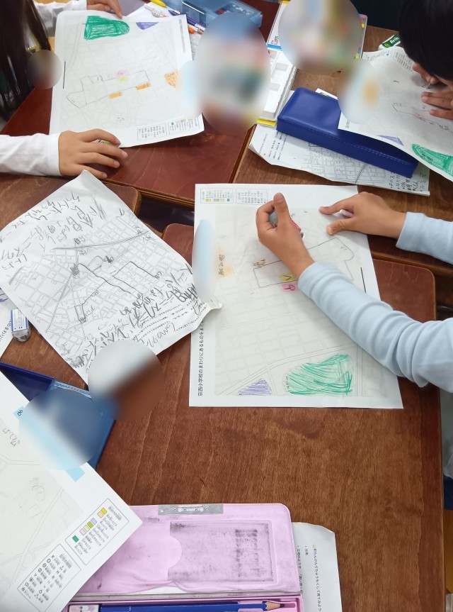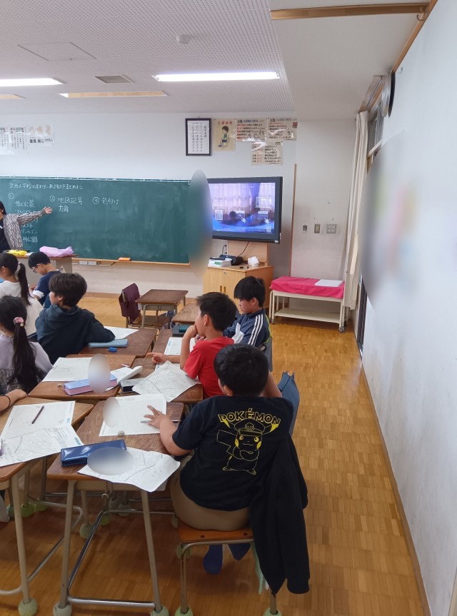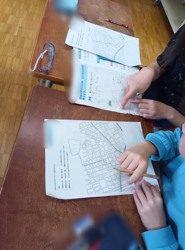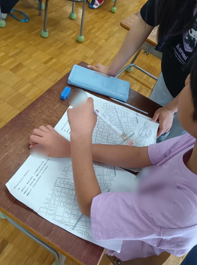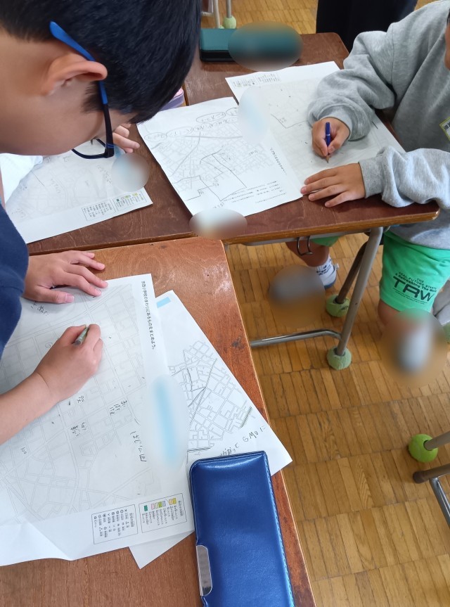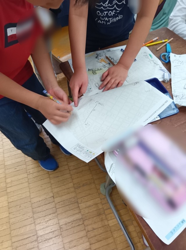 今回の学習では、「地図」という普遍的な情報でルートや場所を追いかけているので、みんなで同じ土台で話ができるということもあります。地図記号なんかも使っていました。社会科で少し出てきたのかもしれません。3年生になってからまだ1か月の3年生ですが、学習の様子がしっかりと3年生になってきているのを感じます。今回の学習も良い学習になりそうです。