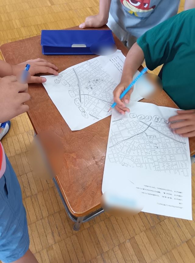 といったやりとりが聞こえます。子どもは結構行動範囲が広いですが、それがうまくつながっていないとか、地図で考えるのは難しいということがあるように思います。今回は馬事公苑方面に進んだ後、折り返して用賀商店街、用賀駅ーという感じで学校の周りを大きくぐるりと回ったようです。逆にそんな風にこれまでに動いたことがなかった「学校」を起点とした動きをすることによって、何かつながるものがあるのかもしれないなと思うのです。つまり、