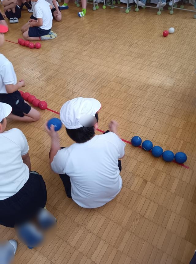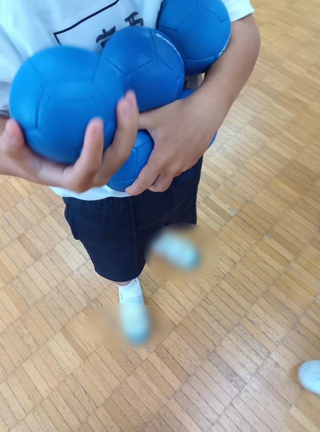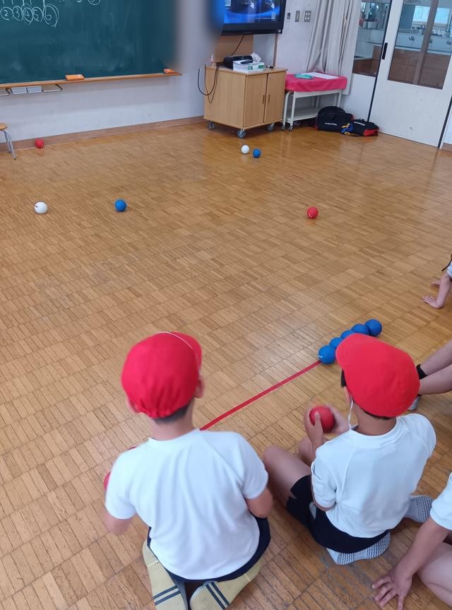校庭が使えないと、校庭体育もできません。そんなときは、よく教室や多目的室などでボッチャをしています。今日は3年生がボッチャをしているのに出会いました。