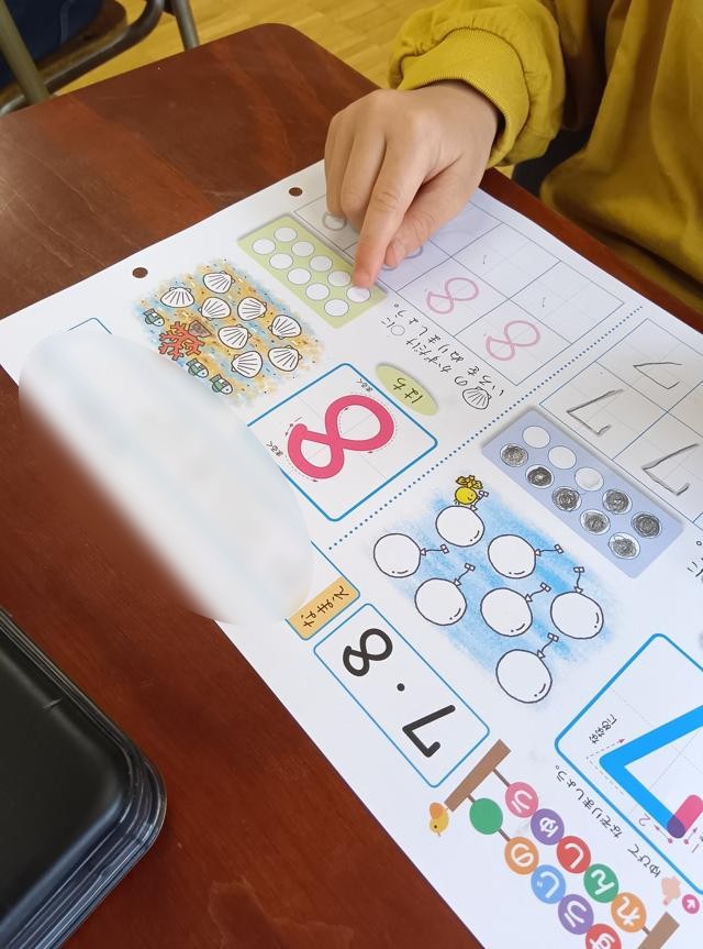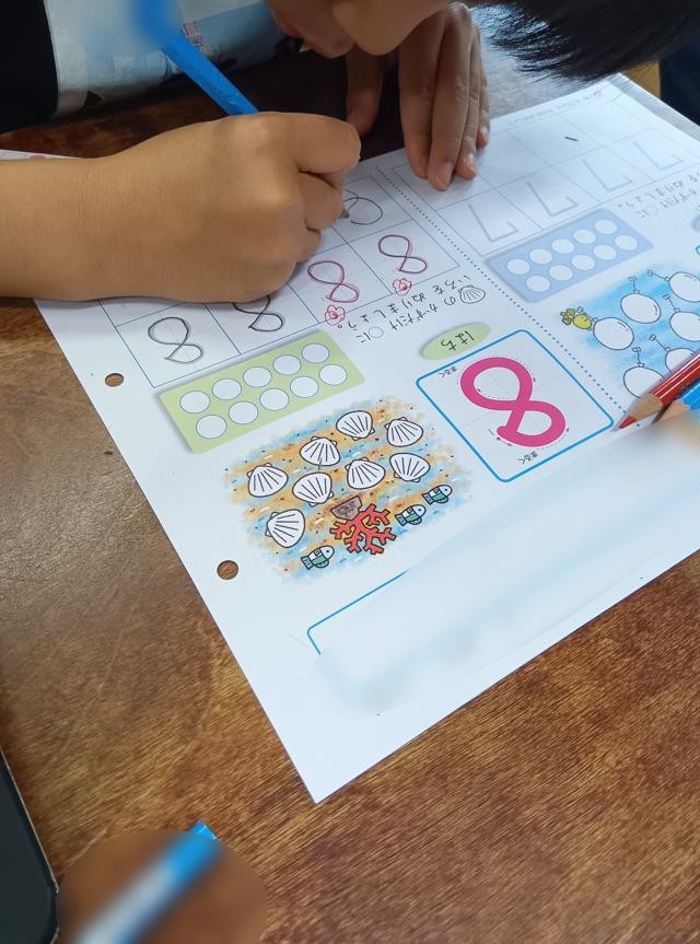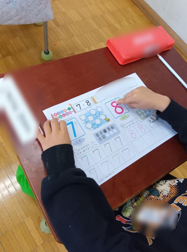 丁寧に字を書くルートを説明してから、お手本の大きな8をなぞってみます。それから何度もみんなで空書きをして練習したら、薄く書かれたなぞりから始めて練習していきます。その後は、書いてある8つの○を数えたり、色を塗ったりして「8」という数をしっかり認識していきました。