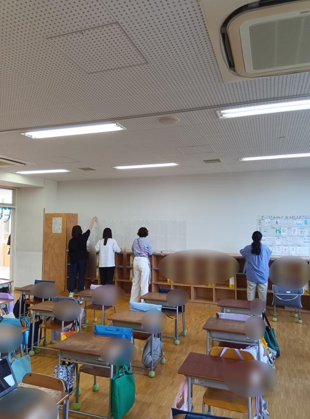 全て名前のシールを貼りかえます。机はもちろんそれぞれの組へ。掲示用のケースも名前シールを付けて、後ろに全て貼り付けました。中には、