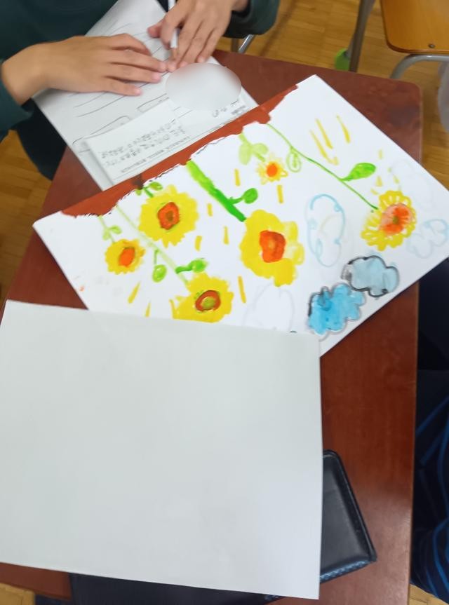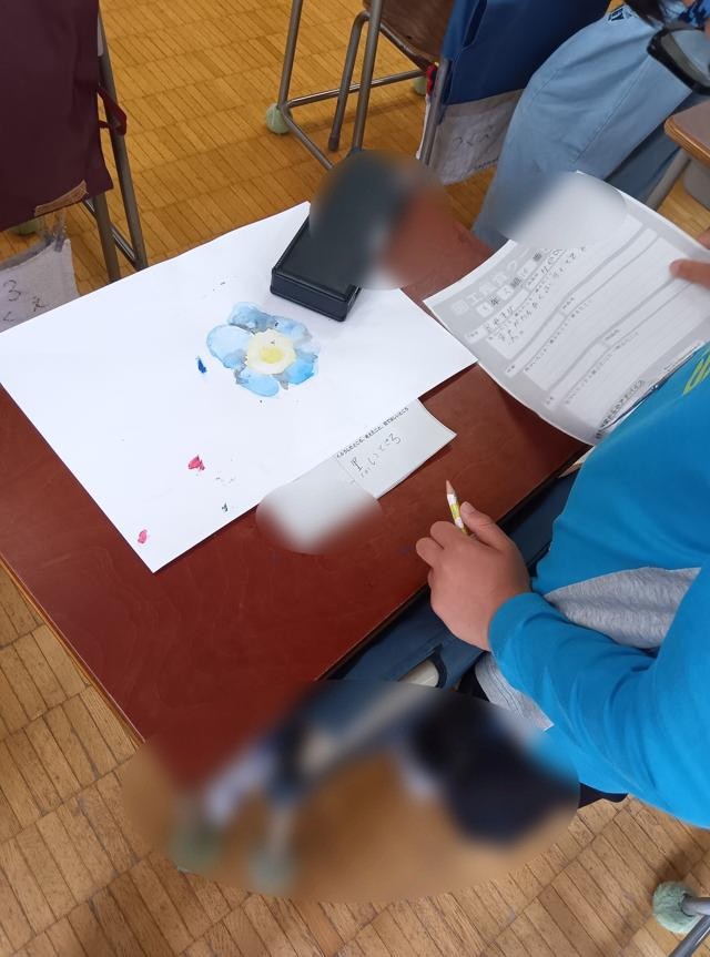 絵の具を使って描いた「花」の絵を鑑賞しています。3年生の初めの図工に描いていた絵だと思います。名札が付けられ、タイトルやコメントも付けられて仕上げられていました。それぞれの机に置いた絵をみんなが見て回ります。