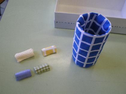 子どもたちはペットボトルや牛乳パック、空きかん、空き箱、着られなくなった服など思い思いの物を持ち寄り、ペン立てやえん筆立て、箸置きなどを作成しました。