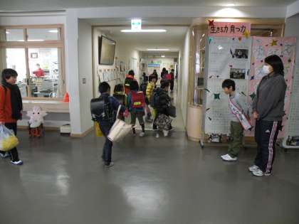 6年生は12月末まで「あいさつ運動」を行っています。昇降口で下級生を迎えています。今日、6年生を見たら、タスキを着けて下級生を迎えています。意識を高めるにはとてもよいタスキです。