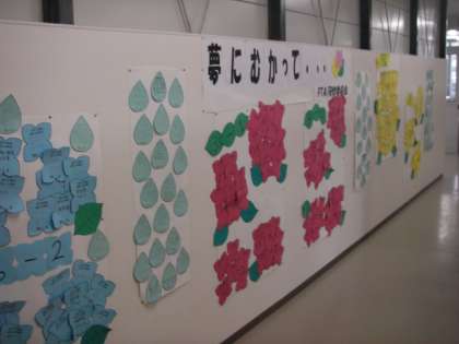 集まったアンケートをまとめ、2階の廊下に掲示してくれました。一人一人の将来の夢を読んで行くと心が弾みます。人はどこに向かって進んでいくのでしょう。それは夢に向かって進んでいくのだと思います。だから人は、つま先はいつも夢の方向に向いています。夢に向かってちょっと前のめりになっています。未来の社会をつくる子どもたちとは、いつも夢にむかって進んで欲しいと願っています。