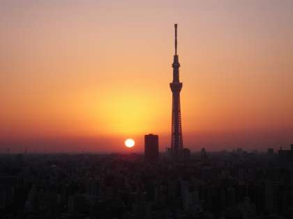 2日は快晴です。自宅のベランダから日の出を映しました。スカイツリ—の左側から太陽が昇ってきます。美しい日の出でした。