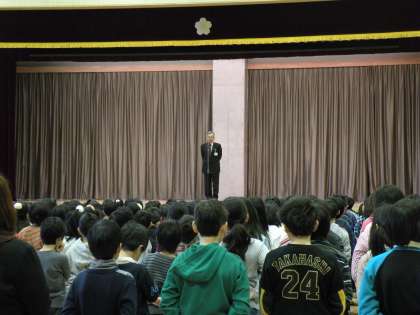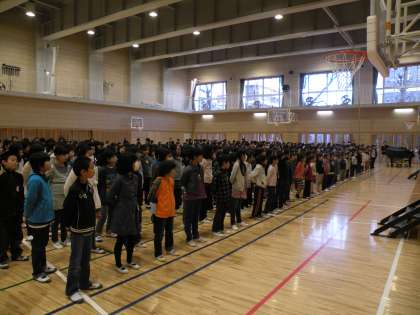 子どもたちはきちんと整列しています。校長は年賀状の話の後に3学期はあいさつ、そして、体力づくりで持久走を頑張りますとの話がありました。