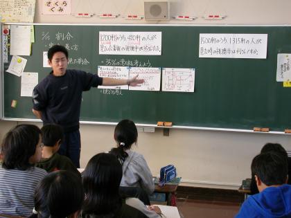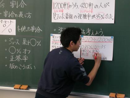 5年生、算数の授業。単元は「割合」。難しい単元です。今日は%(百分率)の導入。身近にある「%」の表示から、その秘密を探りました。視聴率35%の意味をしっかり理解した1時間でした。