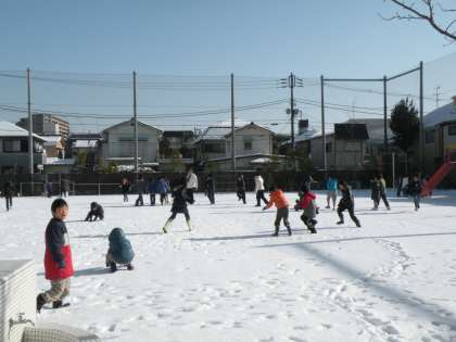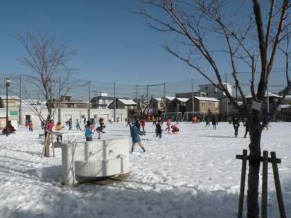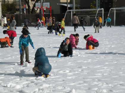 今日は特別に雪遊びです。第二校庭、屋上、校庭と雪が積もっています。学年ごとに時間を決めて雪遊びです。冷たいのでしょうが、とても楽しそうです。