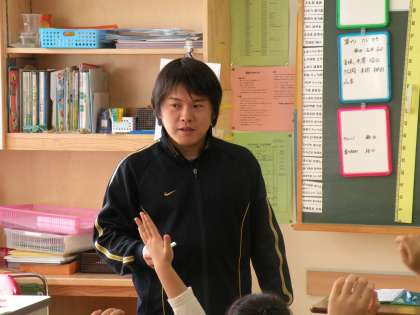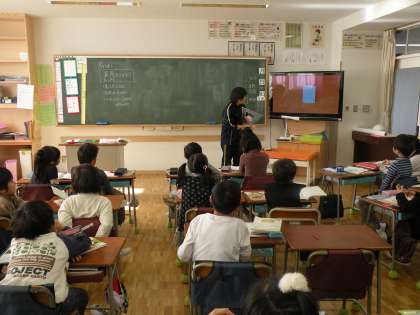 2年2組も算数の授業でした。「直角をさがそう」という課題です。便利だなあと思うのは、実物投影機と50インチテレビです。子どもから「消しゴムのかど」との意見が出ました。大塚先生は早速子どもから消しゴムを借りると実物投影機で写してみます。直角定規を当てると、なるほど直角になっています。どのクラスにも実物投影機と50インチテレビはあるのです。(校長 箭内)