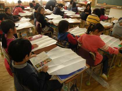 2年1組は小川先生です。生活科の授業です。「たこ作り」です。生活科は生活上必要な習慣や技能を身につけさせることもねらいの一つになっています。まず自分で挑戦してみよう、作ってみようが大事なのです。