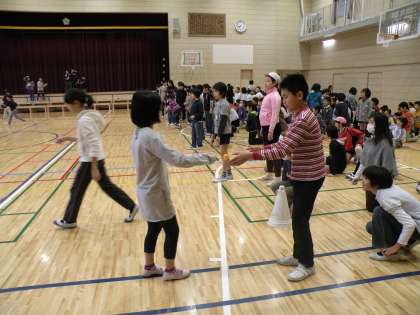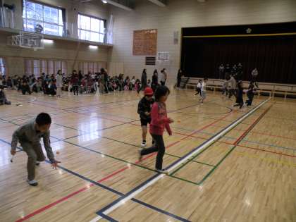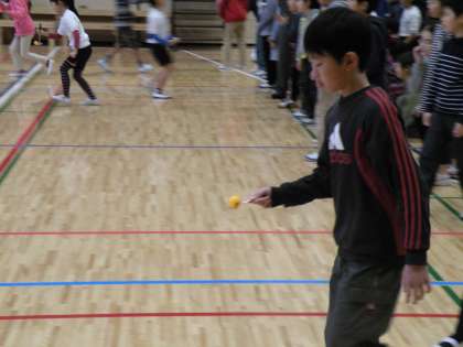 今日の児童集会は「ピンポン玉運びリレー」です。低・中学年はお玉にピンポン玉をのせて運びます。高学年は、さじにのせて運びます。さじで運ぶ時は走るとピンポン玉が落ちてしまいます。そおーっと、急いで運んでいます。集会委員の子どもたちが色々考えて集会を盛り上げています。(校長 箭内)