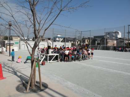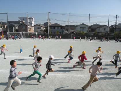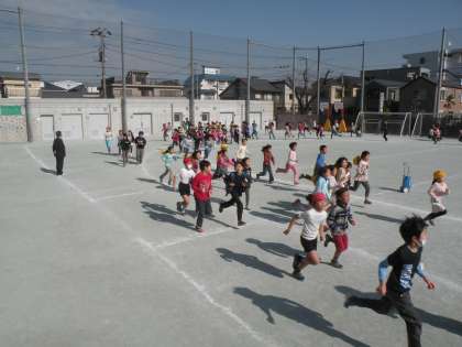 体力づくり 3学期は持久走です。20分休みは、1、2、3年生が走ります。昼休みは、4、5、6年生が走ります。準備運動をしたあと、5分間走ります。実際に走ってみるといい運動になります。この写真は、1、2、3年生の様子です。(校長 箭内)