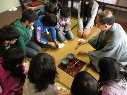 地域の方々の協力があってこそできる茶道教室なのです。保護者の方がお手伝いに参加してくださいました。有難うございます。<校長 箭内>