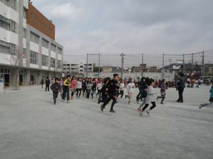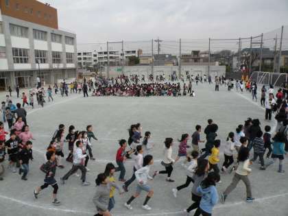 今日の体育朝会は持久走です。今まで練習してことのまとめです。まず1〜3年生が走りました。次は4〜6年生が走りました。練習を積んできているのでぶつかったりすることはありません。上手に走るコースを選んでいます。