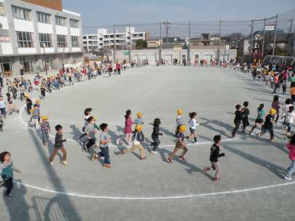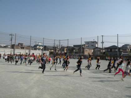来年度は体力づくりのために朝遊びに加えて、朝マラソンを行う計画です。今日はその練習です。8時25分から1〜3年生、4〜6年生と分けて朝マラソンを行います。今日は1〜3年生が走ってみました。(校長 箭内)