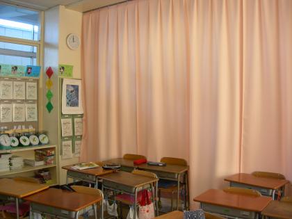 3年生の教室にも体育で着がえるときのカーテンがつきました。普段は両はじにとじてあります。着がえごこちはどうですか?