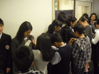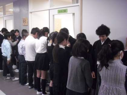 3月25日(月)、今日は「卒業式」です。6年生が登校してくると、5年生が6年生に胸花をつけます。一人一人の6年生に5年生一人一人が「ありがとうございました」の気持ちを込めて胸花をとめました。(校長 箭内)