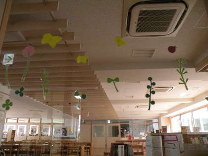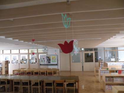 図書室の掲示版には「入学・進級おめでとう」の桜の装飾があります。入口のガラスには萌えいずる草花の飾りがあり、図書室の天井からはチューリップなどが飾られています。本は友達。今年もたくさんの本を読んでもらいたいと思っています。素敵な図書室にしてくださり有難うございます。(校長 箭内)