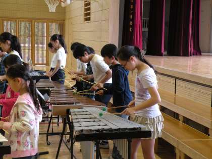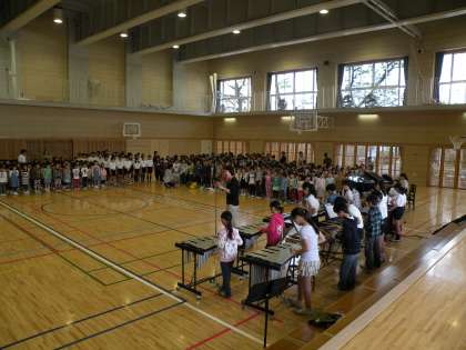 今日は木曜日、木曜日は集会(朝会)の日です。今日は音楽朝会です。みんなで「京西さくら組」を合唱しました。京西さくら組は百二十周年の時つくられました。テンポが良くて歌詞も親しみやすいので子どもたちに人気の歌です。子どもたちの大きな歌声が体育館に響き渡りました。同時に演奏をする音楽委員会のデビューでもありました。(校長箭内)