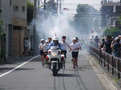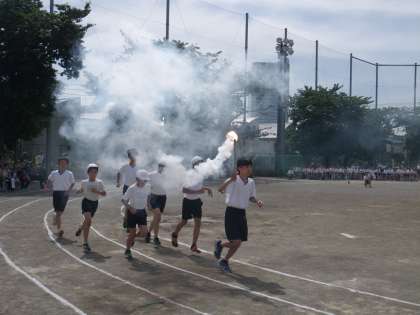 今日は用賀中学校の運動会です。毎年この時には聖火リレーをしています。用賀中学校、用賀小学校、そして、京西小学校の生徒・児童が白バイを先導に用賀小学校をスタートし、京西小学校をめぐり用賀中学校の運動会会場まで聖火リレーを行います。最後は聖火台に点火です。快晴に恵まれ今年も聖火リレーが無事終わりました。用賀中学校の運動会も生徒の全力で駆け抜ける姿にたくさんの声援が送られました。(校長 箭内)