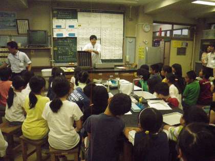 理科の授業は「電気のはたらき」です。用賀中学校の理科の先生が最後に登場し、見えない電気を見えるようにする装置を持ってきてくださり実験をしてくれました。おおいに盛り上がりました。