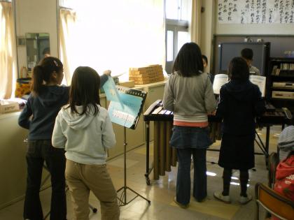 2月29日、各グループで考えた「冬の歌」のリズム発表会がありました。グロッケンやタンバリン、マラカスなどの楽器を使って演奏しました。それぞれの良さが表れていて、冬を感じました。
