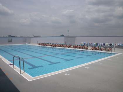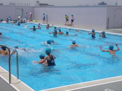 4年生は今日が初めての水泳です。いままで雨や気温が低かったため入れませんでした。まちに待った水泳です。プールの中に入るととても気持ちよいのですが外に出ると寒そうです。プールサイドに腹ばいになって体を温めていました。(校長 箭内)
