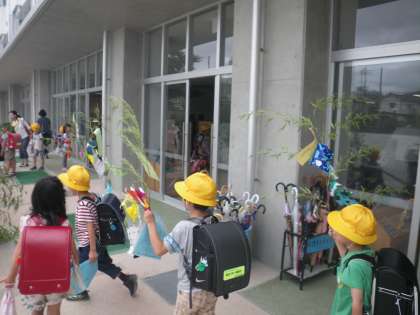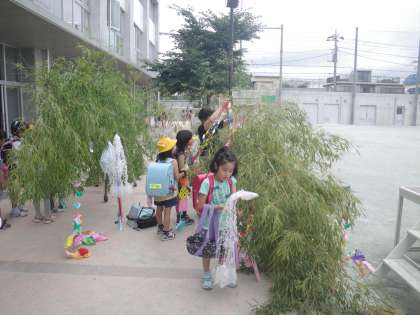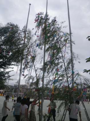大きな竹は掲揚ポールに立てました。毎年天気が心配です。5日の朝、登校しますと雨と風でたくさんの飾りが飛ばされてしまっていました。しかし、願い事を書いた大きな竹は風を受け、空に向けグンと胸をそらすように立っています。9日まで飾ります。
