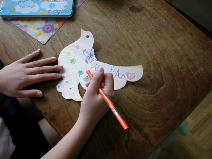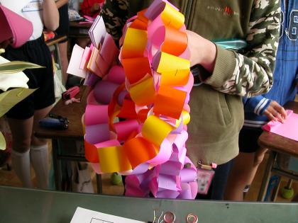 5年生は今、「6年生を送る会」に向けて準備を進めています。体育館の飾り付けに一生懸命です。6年生一人一人に向けて「はと」の装飾や輪かざり、クローバーなどです。当日は体育館が温かい雰囲気に包まれることでしょう。5年生は在校生の代表としてがんばります。
