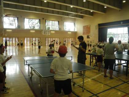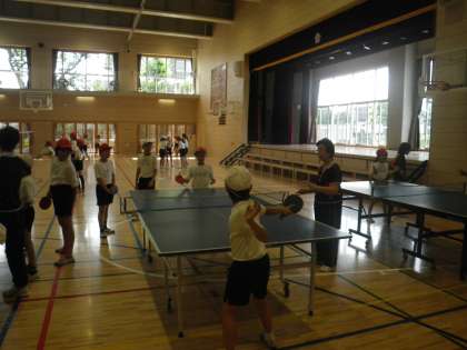 京西小学校のクラブには様々な方が関わってくださっています。卓球クラブには、いつも体育館で練習している卓球クラブの方が指導に入ってくださっています。今日は1学期最後のクラブです。審判をしてくださっています。(校長 箭内)