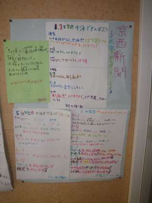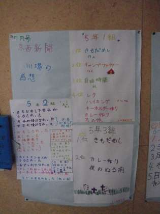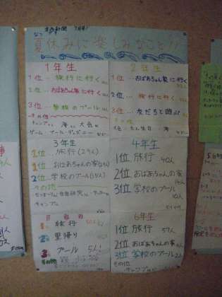 広報委員会が毎月新聞を作っています。7月号を見てみました。「夏休みの楽しみ」特集がありました。全学年、楽しみなことは旅行が1位です。(おばあちゃんちに行くも含む)みんな、家族旅行が楽しみなのだなあと分かりました。水泳で頑張ることの特集があり、5年生「川場の思い出」特集では、肝試しが上位を占めていました。そして、6年生の、これから行く日光についての記事が載せられています。子どもたちの気持ちがよくわかる壁新聞です。(校長 箭内)