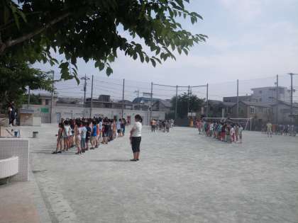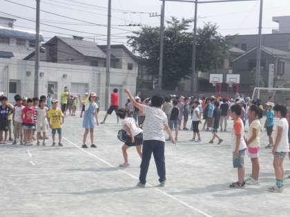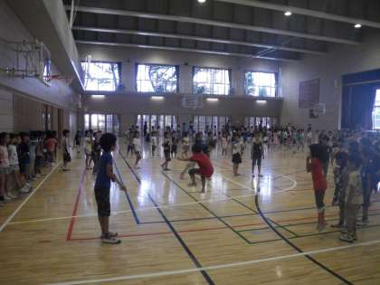 今日の体育朝会は長縄です。今年は体力向上が重点の一つになっているので朝マラソンの他にも縄跳びに挑戦しています。今日は長縄です。1、2年生は体育館、3年生以上は校庭です。暑さを考えて今日は3分間の記録をとりました。これから子どもたちは頑張っていきます。目標は6年生は500回です。(校長 箭内)