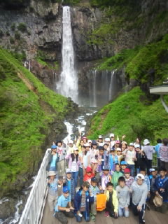 2日目の最初は華厳の滝です。一番に到着です。虹がかかっています。