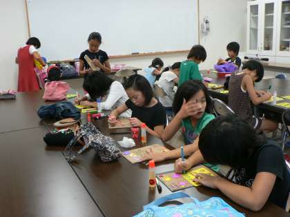 京西小の英語支援員として活躍している小島さんが講師となり、楽しく英語が学べる講座が開かれました。英語に親しみながらオリジナルノートを作る講座で、今回は34年生の子どもたちが対象でした。発音練習など英語の言葉に慣れ親しんだ後、英語の文字などをデザインに使った素敵なノートができありました。参加した子どもたちは皆嬉しそうでした。(副校長 藤咲)