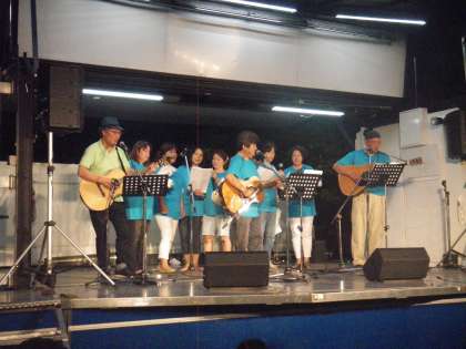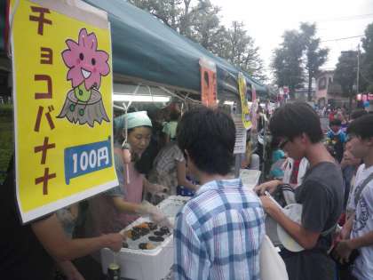 今年もPTAはサマーステージにお店を出しました。今年は去年よりもバージョンアップです。チョコバナナの他にチョコワッフルとチョコチーズドックが加わりました。2日間とも完売です。4時ごろから9時過ぎまで連日の作業でした。暑い中保護者の方々が頑張ってくださいました。みんな仲良く楽しそうにお店を運営してくださいました。ありがとうございます。ステージでは用賀商店街振興組合理事長の小林さんもステージに立っていました。懐かしいフォークソングを聞かせてくれました。おはようコミュニケーションデーのポスターは毎年、商店街振興組合が作ってくださっています。(校長 箭内)