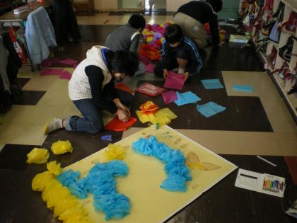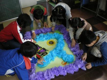 おはながみで6年生を送る会のボード作りをしました。「ご・卒・業・お・め・で・と・う」をカラフルなおはながみで彩りました。明日の6年生を送る会、その後のお別れ給食が楽しみです。