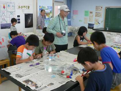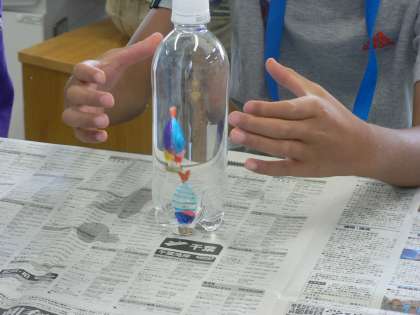 水の中を浮いたり沈んだり、不思議なおもちゃ?「浮沈子」を作りました。講師の先生から作り方だけでなく、その仕組みを教えていただきました。科学の勉強をしながら楽しい工作をしました。ペットボトルの中のカラフルな魚が浮いたり沈んだり。自分の作品が完成し、子どもたちは皆満足そうでした。(副校長 藤咲)