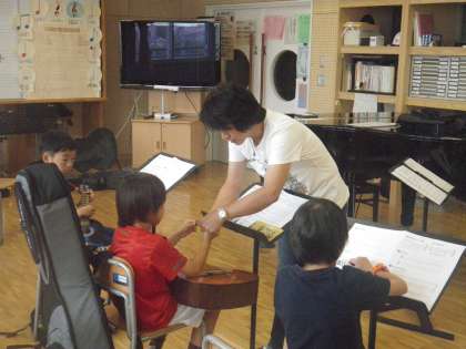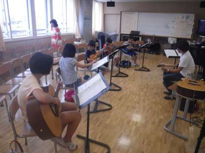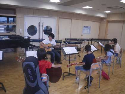 2日の午後は「アコースティックギター教室」です。講師は竹森 久晃さんです。プロの先生です。保護者でもあるので講座を開いてくださいました。限定5人に選ばれた子どもたちはちょっと緊張気味です。しかし、参加した子どもはみな初めての経験なので先生は大変です。でも先生が一つ一つ丁寧に教えてくださるので子どもたちも頑張ります。ギターが弾けるようになったら人生も楽しくなるだろうなあと思います。習い事は6才の6月6日からといいます。素敵な講座の一つです。ありがとうございました。(校長 箭内)