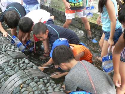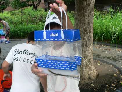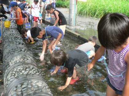 今日は用賀町会主催のお祭り「納涼の夕べ」が、いらか道であります。そして、毎年恒例の昼間のイベントの「どじょうすくい」が行われました。町会の方が水路にどじょうをたくさん放流し、子どもたちがそれをすくいます。京西小学校の子どもたちも大勢参加し、皆ずぶぬれになりながらどじょうを追いかけました。悪戦苦闘する子が大勢いる中、器用に何匹も手ですくい上げる子もおりました。暑い夏にはぴったりのイベントで、子どもたちは皆、大はしゃぎしていました。夕方暗くなると、今度は灯ろう流しが行われます。昨日の「このゆびとまれ」で作った灯ろうを浮かべます。楽しみですね。(副校長 藤咲)