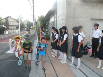 9月3日4日はようがの学び舎「おはようコミュニケーションデー」です。京西小学校には用賀中学校の生徒が来てくれています。用賀中学校は京西小のほかに用賀小にも行っているのでちと忙しいです。用賀中の生徒は京西小の卒業生も多数いるので懐かしい顔が見られて嬉しいです。街の通学路にものぼりを持ってあいさつに行っています。いらか道には用賀中学校の先生が来てくれていました。用賀町会の方・学校運営委員の方も参加してくださいました。ありがとうございます。(校長 箭内)