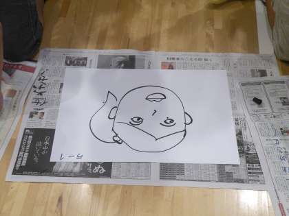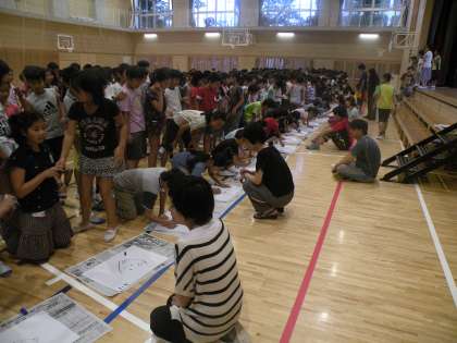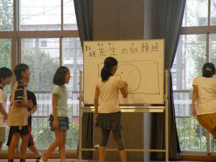 今日は2学期最初の児童集会でした。「先生の似顔絵を描こう」ゲームです。集会委員の子どもたちが舞台で見本を示します。さて、早速描き始めました。1人が少し描き、次へとバトンタッチしていきます。みん共同作品ですが上手に描けています。