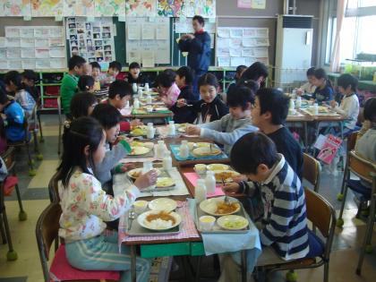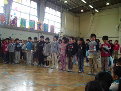 お別れ給食では、班ごとに質問とクイズを用意して、楽しく給食を食べました。給食の最後には6年生からの出し物があって、みんな大喜びでした。1年生のたどたどしい質問やクイズに、優しく答えてくれる6年生がもうすぐ卒業なんて、やっぱり寂しいです。