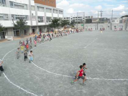 2学期の朝マラソンが今日から始まりました。今日は低学年です。準備体操をしてゆっくり走り始めます。
