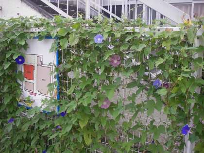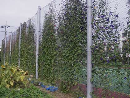 今年は朝顔がことのほか大きく育っています。第2校庭のフェンスは朝顔のカーテンがひかれているようになっています。北門の横のフェンスも朝顔でおおわれています。朝顔の伸びようとする生命力に感心しています。
