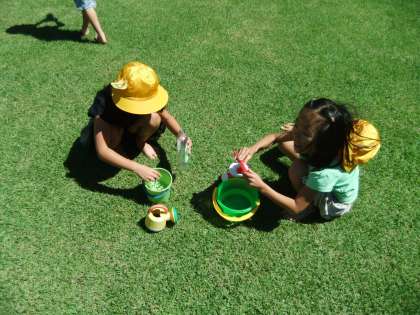 台風一過の爽やかな秋晴れの中、1年2組は、3時間目の生活科に時間に第二校庭で水遊びをしました。水鉄砲でかけあいっこをしたり、おままごとをしたりと、思い思いに楽しんでいました。もう秋の日差しで、日蔭は涼しく、絶好の休憩ポイントでした。