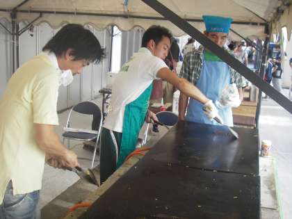 磯辺焼きを束になって買っていく人がいました。おいしいのでしょう。焼きそばは、京西小の先生が焼いていました。できた焼きそばをお母さん方がパックに詰めていました。