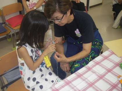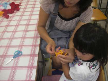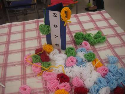 ものづくりの部屋では、ミサンガ作りをやっていました。自分の指に毛糸をまいて作っていきます。人間の知恵に驚きます。
