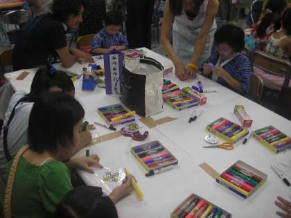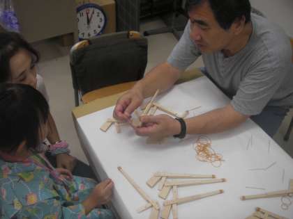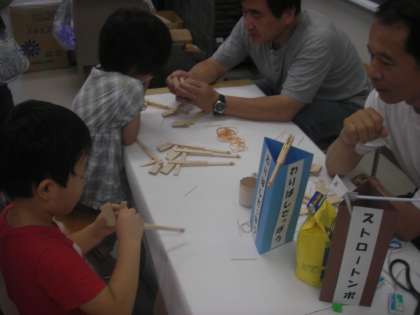 ものづくりの部屋では、キラキラバッチやわりばしでっぽうコーナーがあり子どもたちが挑戦しています。このゆびとまれの高橋さんなどが担当してくださっています。