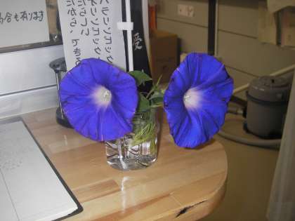 学校に戻ると受付に、朝顔が活けられていました。すべてのことは、誰かが見ていますよと言っているようでした。